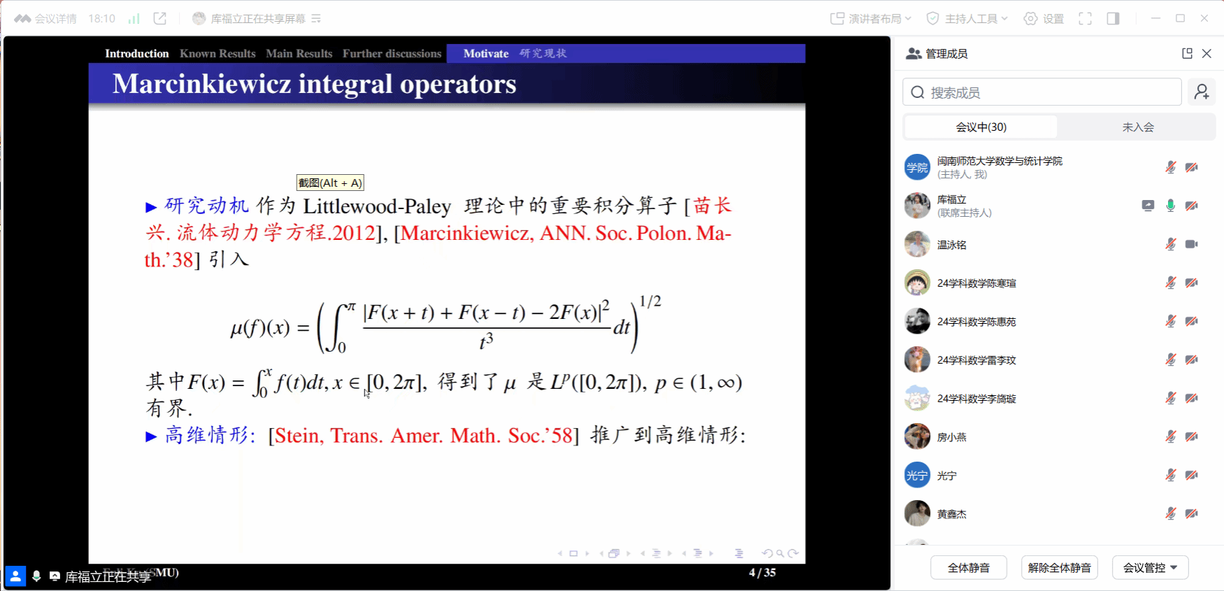邀请,4月20日早上,三明学院信息工程学院库福立博士在腾讯会议中作了题为《The boundedness of square function operators on generalized Campanato spaces》的讲座。相关师生聆听了此次讲座,该讲座由温泳铭老师主持。