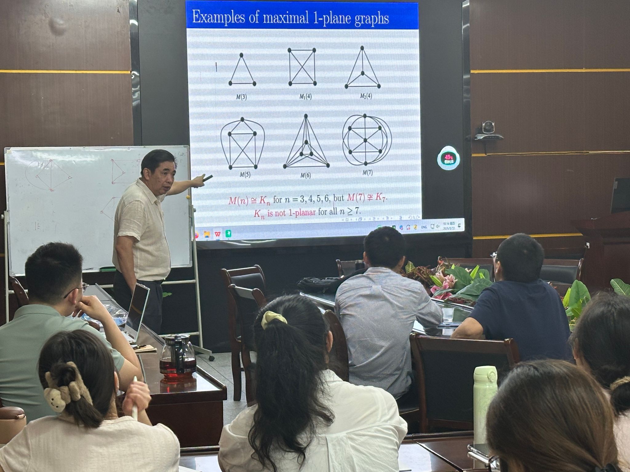 讲座中,董峰明教授主要为听众介绍了1-可平面图。1-可平面图是指能够在平面上绘制,且每条边最多被交叉一次的图。若一个1-可平面图按此方式绘制,则该画法称为1-平面图。若一个图无法在不破坏其1-平面性或简单性的前提下添加任何边,则称其为极大1-平面图(或极大1-可平面图)。近期,黄元秋等人针对相关课题发表了其团队的研究成果,董峰明教授作为研究团队中的一员,针对该研究成果——对于任意n(≥5)个顶点的极大1-平面图,其边数至少为[数学公式],且该下界对所有整数n≥5均为紧的相关证明进行了详细解说。