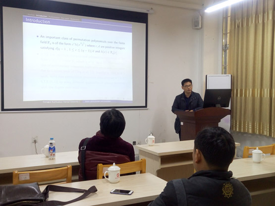 在报告中,许广魁副教授首先介绍置换多项式的多项式函数的构造;其次重点介绍置换多项式的证明,包括多项式函数无解的条件和模的选择;最后介绍置换多项式的主结构和次结构。报告结束后,在座的老师和学生就相关研究问题进行了探讨和交流。
