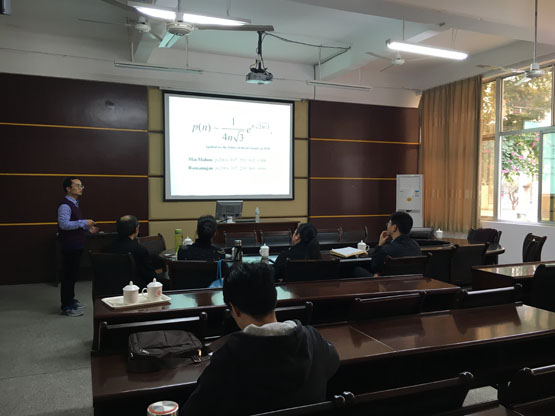 S.A. Ramanujan(拉马努金)是著名的印度数学家,也是数学史上最具传奇色彩的天才之一。其重要的研究成果涉及素数分布理论、整数分拆、无穷级数等众多领域。例如,他给出了整数n的分拆函数P(n)的估计式,并证明了P(n)的渐近公式。在报告《Ramanujan congruences and others》中,林丽双副教授首先从数论的角度简单介绍了大家熟知的Ramanujan congruences、Ramanujan’s conjecture、Erdös’ Conjecture等相关知识。接着从cubic的角度介绍了Ramanujan’s cubic continued fraction、Overcubic partition、Cubic partition pairs等重要结论。最后,林副教授介绍了其团队近年来开展的关于cubic方面的研究工作。报告结束后,在场的老师和学生就相关研究问题进行了探讨和交流。