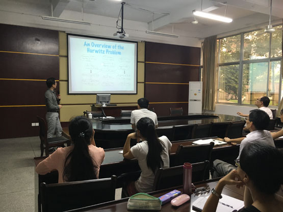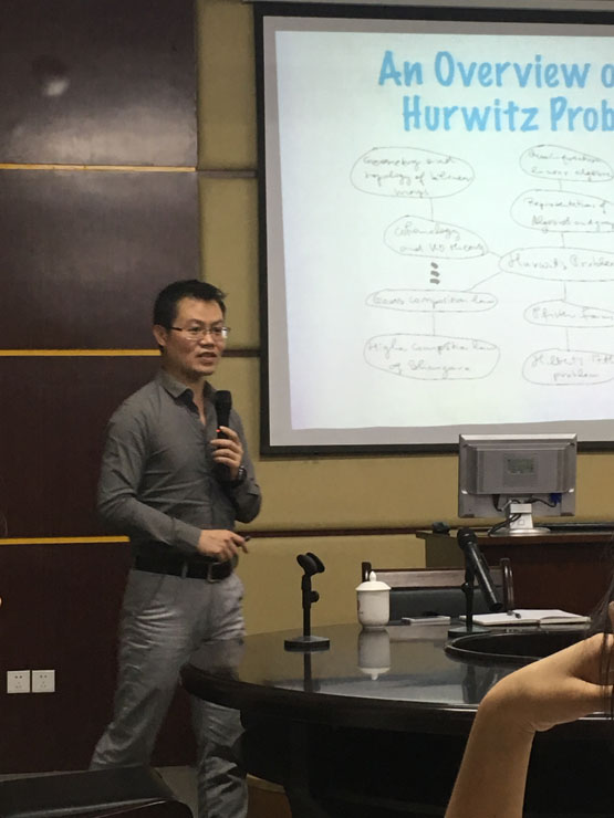 在报告中,黄华林教授先从大家熟悉的二次型配方公式出发,简单介绍了Hurwitz问题。然后以13至17世纪的代数史为线索,先后介绍了Brahmagupta-Fibonacci identity、Euler’s four-square identity、Degen’s eight-square identity、Hurwitz’s 1,2,4,8-Theorem、Hurwitz-Radon Theorem, 最后以通过quasialgebras解决配方问题来介绍当前理论的新进展。报告结束后,在座的老师和学生就相关研究问题进行了探讨和交流。