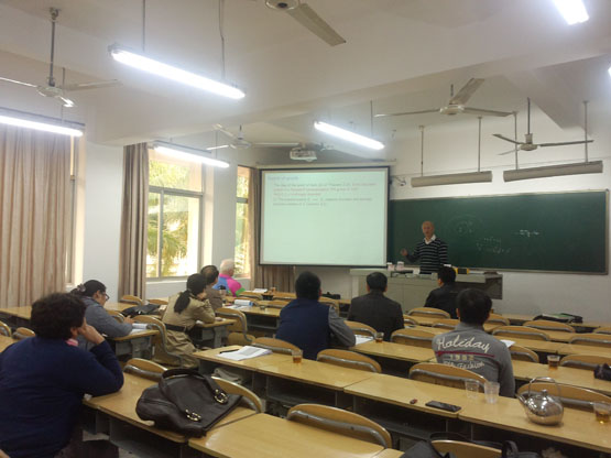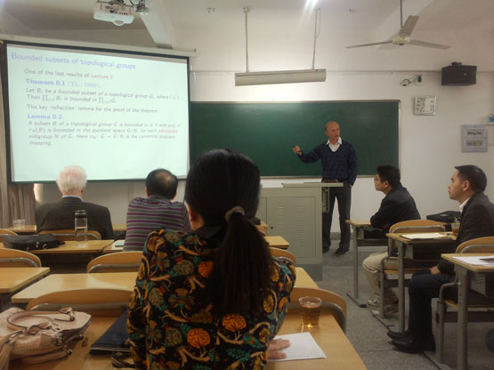 邀请,12月5日至12月9日上午,墨西哥大都会自治大学(Universidad Autonoma Metropolitana) M.G. Tkachenko 教授在砺志楼114分别作了作了《Bounded subsets of topological groups》,《Bounded sets in paratopological groups》,《C-compact and r-pseudocompact subsets paratopological groups》,《Symmetry number and C-compact subsets of paratopological groups》四场报告。相关老师和研究生聆听了此次报告。