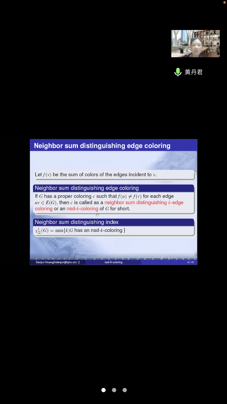 邀请,6月4日下午,浙江师范大学黄丹君教授在腾讯会议作了题为《Neighbor sum distinguishing index of sparse graphs》的报告。相关师生聆听了此次报告,报告由卢福良教授主持。