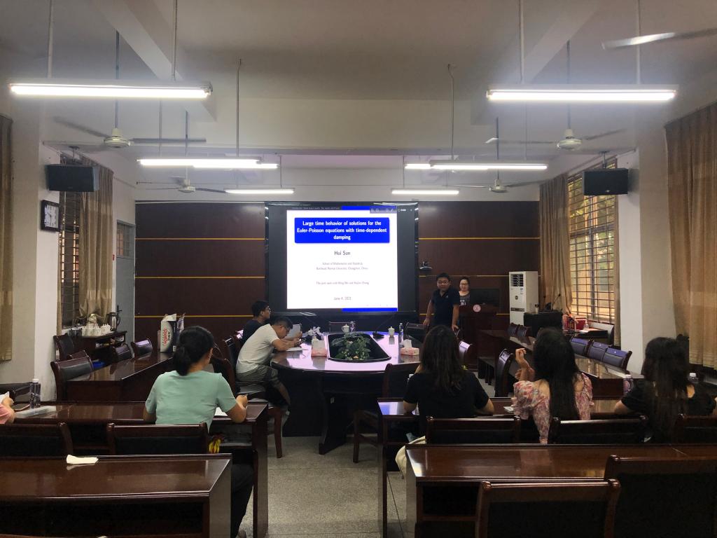 邀请,6月4日晚上,东北师范大学孙慧博士在砺志楼114作了题为《Sub-exponential convergence to steady-states for the Euler-Poisson equations with time-dependent damping》的报告。相关师生聆听了此次报告,报告由刘群副教授主持。