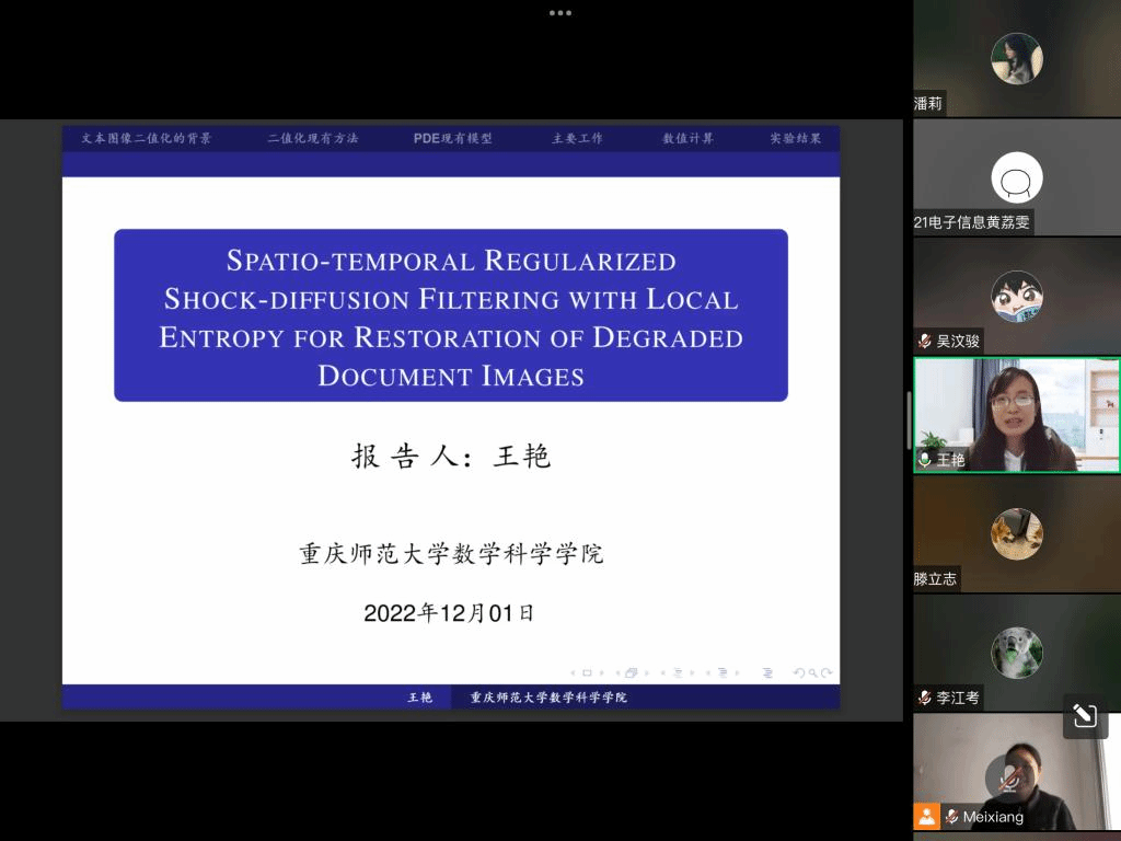 邀请,12月1日下午,重庆师范大学王艳教授在腾讯会议作了题为《Spatio-temporal regularized shock-diffusion filtering with local entropy for restoration of degraded document images》的报告。相关师生聆听了此次报告,报告由黄梅香老师主持。