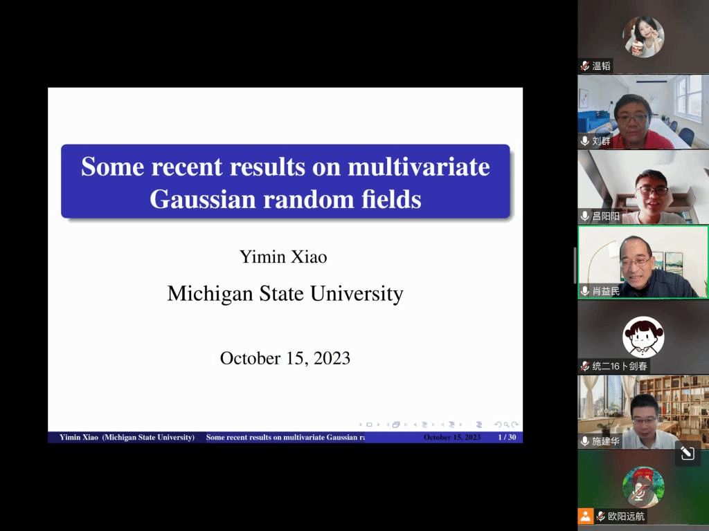 邀请,10月15日上午,密西根州立大学肖益民教授在腾讯会议作了题为《Some recent results on multivariate Gaussian random fields》的报告。相关师生聆听了此次报告,报告由施建华老师主持。