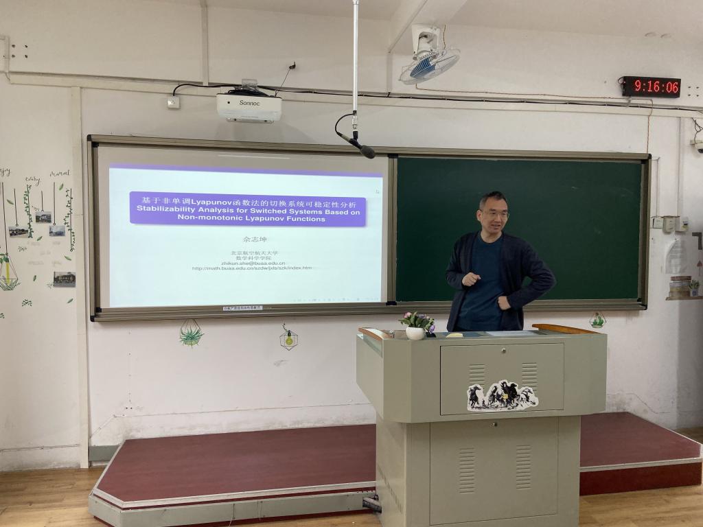 邀请,3月15日上午,北京航空航天大学佘志坤教在综南301作了题为《基于非单调Lyapunov函数的切换系统可稳定性分析》的报告。相关师生聆听了此次报告,报告由李进金老师主持。