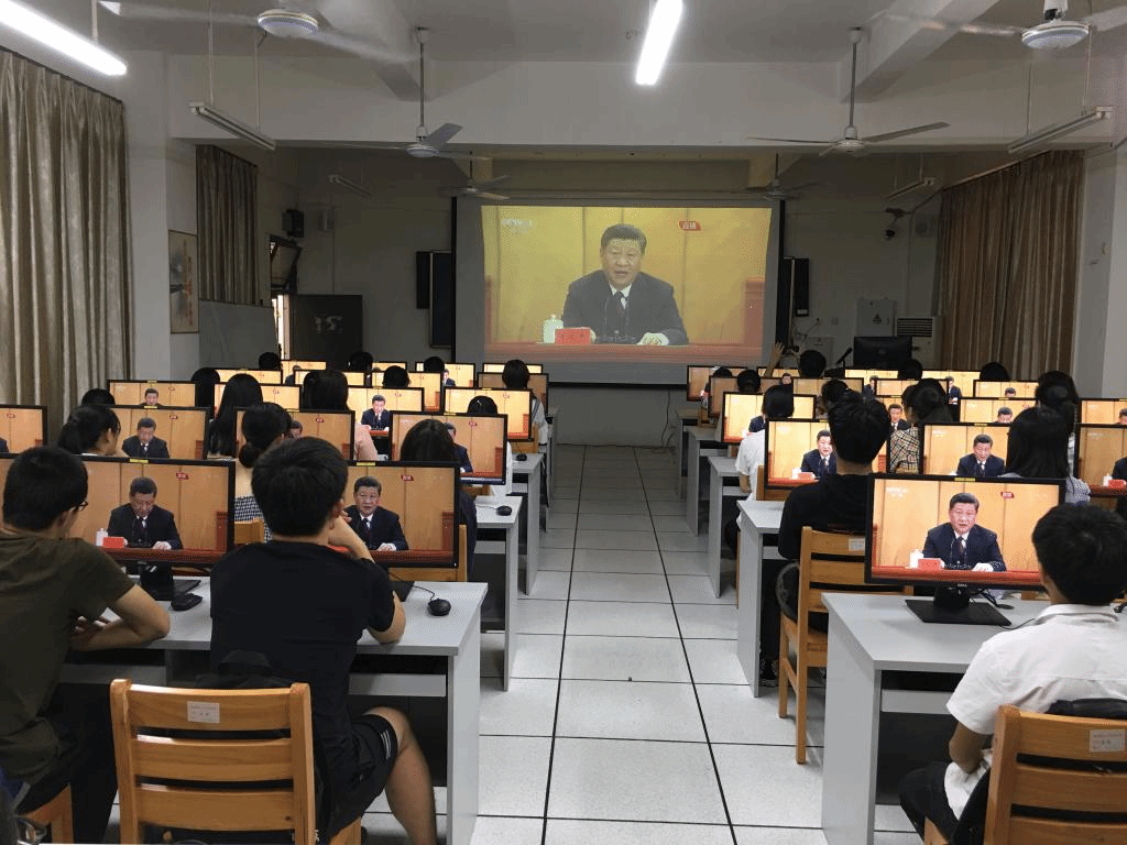 师生在砺志楼110收听收看直播,认真学习习近平总书记在大会上的重要讲话。