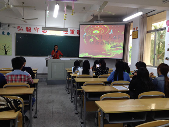 学生党建中心积极策划,通过“线上、线下”两条渠道多种载体广泛组织学生党员及入党积极分子开展学习讨论活动,营造了良好的理论学习氛围。通过“数统学院学生党建中心”微博平台及时转载《中共中央关于全面推进依法治国重大问题的决定》,借助网络平台开展了激烈的微博互动讨论。11月2日,学院分党校借助培训的有利时机,及时组织第七期全体学员以小组为单位广泛开展学习党的十八届四中全会精神活动,各组通过PPT展示、报告、辩论、心得体会交流等形式深入学习了十八届四中全会精神,加深了对依法治国的进一步理解。同时,还组织下班党员、下宿舍党员以班级和宿舍党章理论学习小组为阵地,带领学生掀起学习党的十八届四中全会精神的热潮,引导学生紧跟时事,把自己的人生梦与构建中国特色社会主义法治社会紧密结合起来。