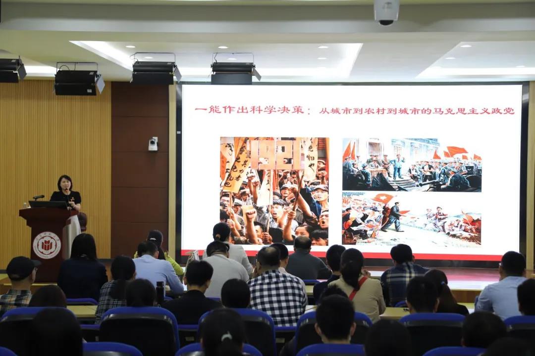 报告中,鄢姿副教授围绕“能作出科学决策”、“能发扬斗争精神”、“能坚持人民立场”、“能团结爱国力量”、“能勇于自我革命”等五个方面讲述了中国共产党为什么“能”,展现中国共产党从建立到壮大、不断推进马克思主义中国化的过程,带领韩国av