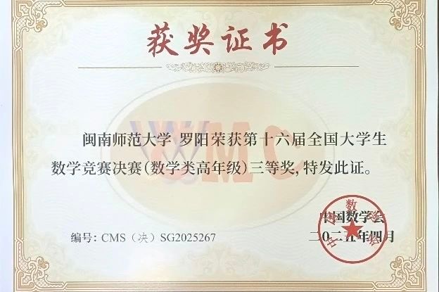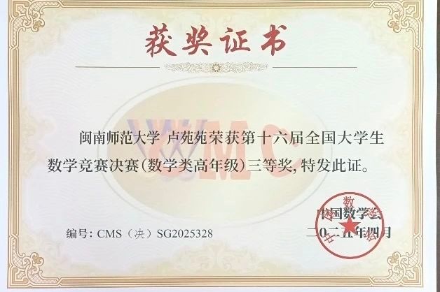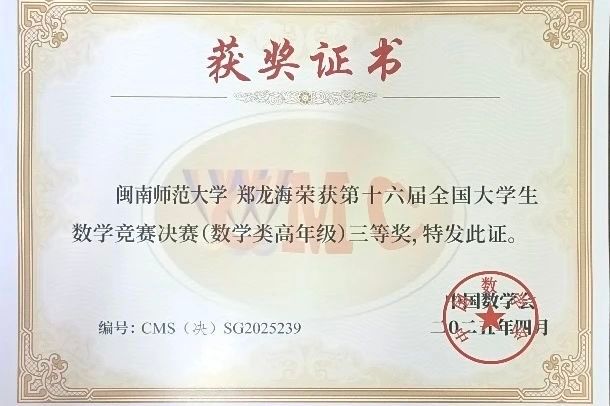 近日,第十六届全国大学生数学竞赛决赛于2025年4月12日在浙江师范大学成功举行。韩国av 21级郑龙海、郑淋、卢苑苑三位同学与22级罗阳同学厚积薄发,以过硬的专业功底和突出的实践能力,在激烈竞争中脱颖而出,最终各自均斩获本次大赛专业组高年级三等奖!