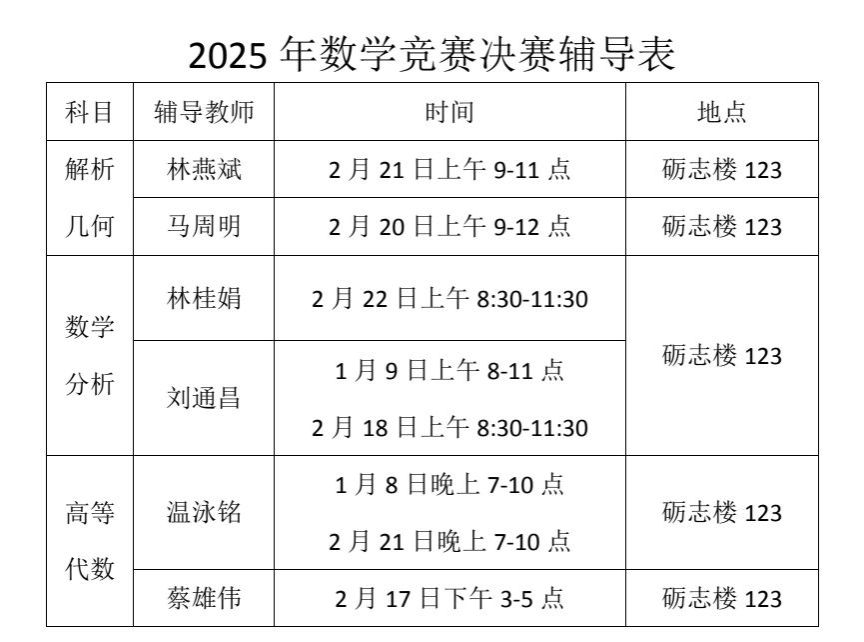 为备战第十六届全国大学生数学竞赛,学院精心组织、统筹安排,由经验丰富的专业教师组成指导团队。各位指导老师为参赛选手提供系统化、针对性的赛前指导。在备赛过程中,老师们不仅注重专业知识的传授,更重视培养学生的问题分析能力和数学思维方法,展现了高度的责任感和敬业精神。学院的高度重视和老师们的辛勤付出,为同学们在竞赛中取得优异成绩奠定了坚实基础。