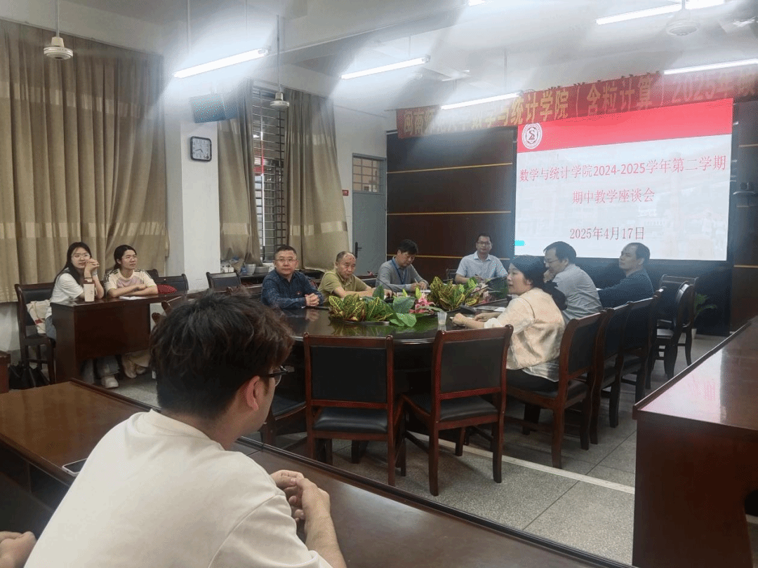 于2025年4月17日下午在砺114召开2024-2025学年第二学期期中教学座谈会。学院党委副书记胡海智、分管教学副院长周仕荣、校督导组委员曾剑斌、院督导组长柳成林,数据计算及应用专业负责人王晓峰、数学与应用数学专业负责人黄菊、统计学专业负责人李气芳、教学秘书康碧芳、各班代表及教学信息员参加座谈。