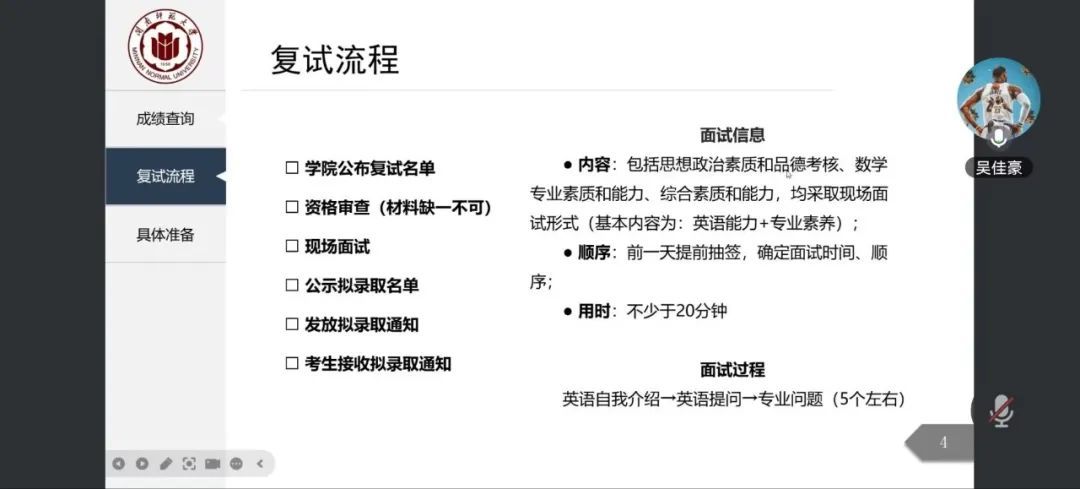 吴佳豪则从成绩查询、复试流程及具体准备三个方面进行了分享。他结合自己的复试经历,提醒考生注意接听复试面试电话,以免错失良机。此外,他还强调了复试准备中紧跟教育学热点的重要性,如“大单元教学”、“双减政策”等。