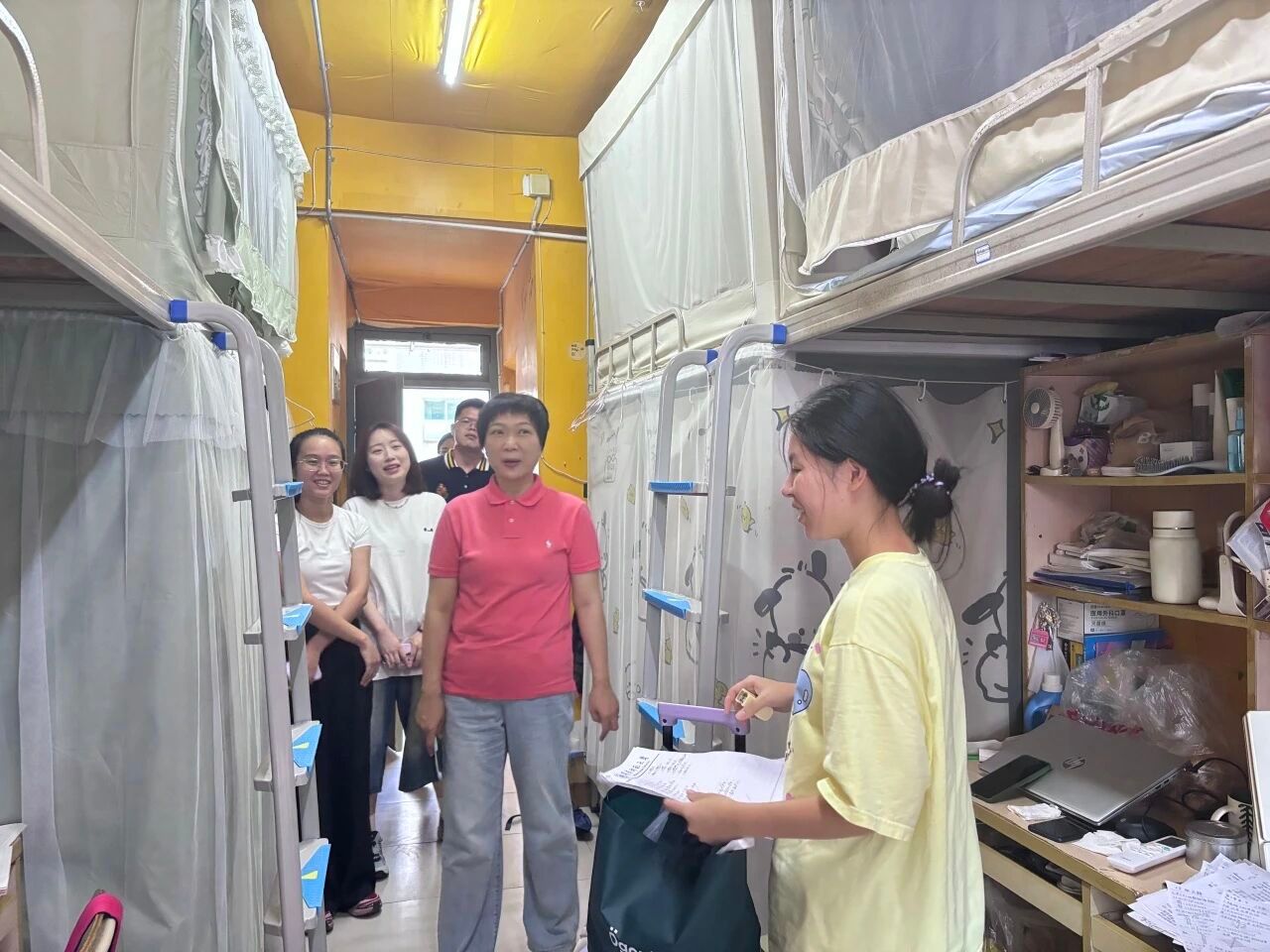 在学生宿舍走访中,学院领导与老师主动与同学们亲切交谈,从生活适应到学业规划,给予全方位关怀。不仅详细询问同学们的暑假生活、返校后的适应情况,还耐心倾听大家新学期的目标与困惑;同时结合宿舍安全规范,提醒同学们注重环境卫生,严格遵守用电安全准则,杜绝安全隐患。交流中,鼓励同学们新学期要锚定专业学习目标,脚踏实地深耕领域知识,同时兼顾劳逸结合,通过体育锻炼等方式强健体魄,为学业进步提供坚实保障。一句句叮嘱与关怀,让同学们在初秋时节感受到温暖,也进一步激发了大家新学期的学习热情与奋进动力。