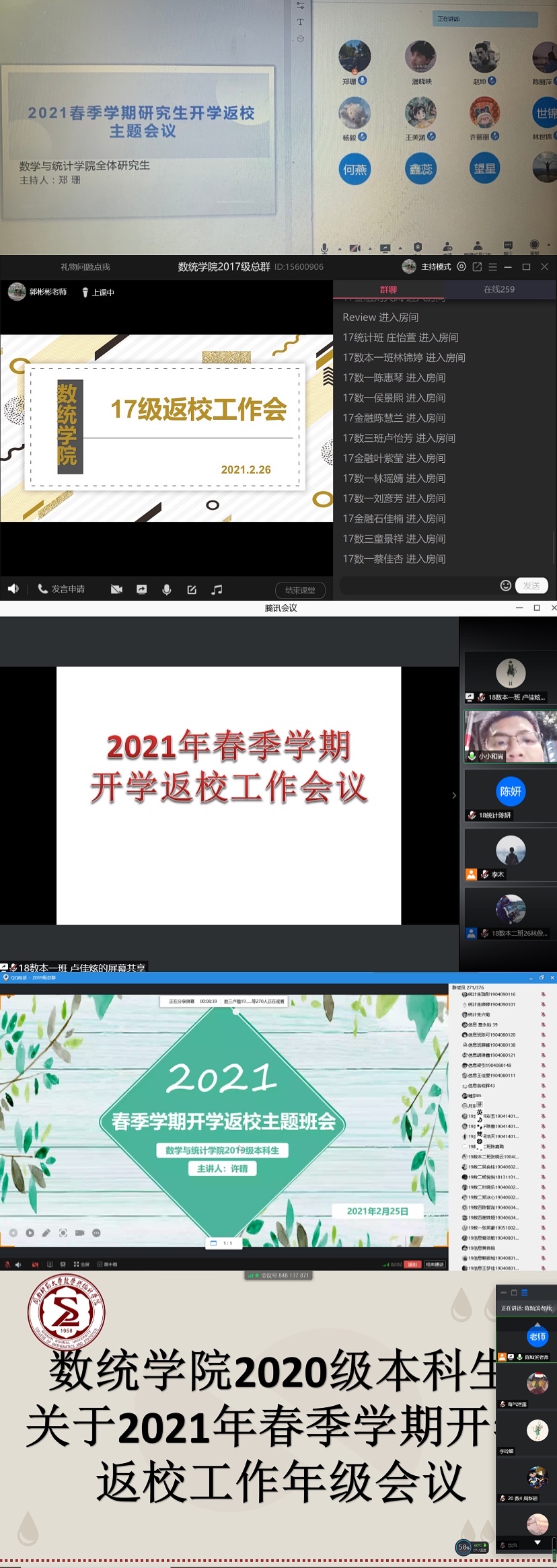 为更进一步落实学校疫情防控和开学准备工作要求,全体辅导员组织学生开展了线上“2021年春季开学返校”主题班会,在线上会议中,各级辅导员从“开学返校通知”、“开学教学安排”以及“疫情防控注意事项”等部分展开班会内容,传达了学校、学院对开学返校工作的部署安排。在返校前期管理上,辅导员一对一落实到人,在每日体温检测、所在地更新行程核实、跨地区报备等工作上形成了班委与辅导员之间、辅导员与学院之间的日报、专门特报的网格化管理长效机制。
