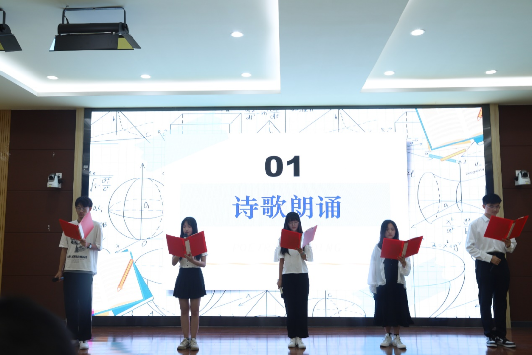 开幕式首先由演诵队带来表演——《数学礼赞》,以数学文化史为经线,以新时代数学科技发展为纬线,讴歌数学先驱所留下的丰功伟绩,用朗诵的方式传递数学智慧,引导同学们发现数学的魅力,弘扬数学之美。