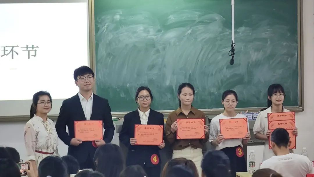 片段教学部分,选手结合自己的教案内容与试讲课题进行10分钟试讲。试讲过程中选手们多运用启发式、探究性提问方式,较好地调动了学生学习的积极性和主动性。绝大部分选手在授课过程中教态得体,教学思路清晰,语言准确简练,板书规范,教学环节完整。最后由评委老师进行点评并打分,计算每位选手的总分,最终排出第一至第十名。