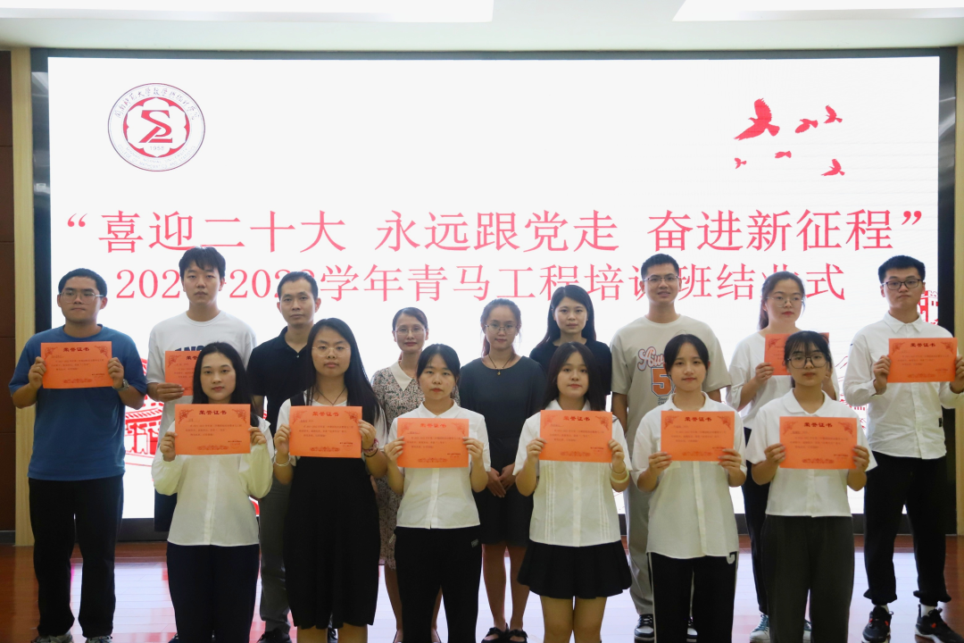 在砺志楼120举办“喜迎二十大 永远跟党走 奋进新征程”2021-2022学年团校培训暨青马工程培训班结业式。学院党委副书记林晓老师、团委书记罗晓林老师、18级辅导员李伟俊老师、研究生辅导员郑珊老师和21级辅导员李巍婷老师出席活动。