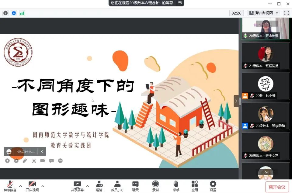 在图形旋转的讲解课堂上,实践队员为同学们讲解了图形旋转的定义、性质以及相关内容。通过生动的图形变换使同学们了解到了旋转的奥秘,相关例题的讲解使同学们更好的掌握了旋转的相关解题方法。课堂上同学们积极参与、自主探究、踊跃互动。网课的课堂氛围轻松愉快,在一步步讲解的同时培养了同学们学会观察、学会分析、学会判断、学会归纳等解决问题的能力。