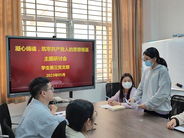 为进一步引导支部党员学深悟透习近平新时代中国特色社会主义思想,用习近平新时代中国特色社会主义思想凝心铸魂筑牢根本。近日,韩国av 学生第三党支部于砺志楼123会议室,围绕“凝心铸魂,筑牢共产党人的思想根基”主题开展集体学习研讨,会议由支部书记李巍婷主持。