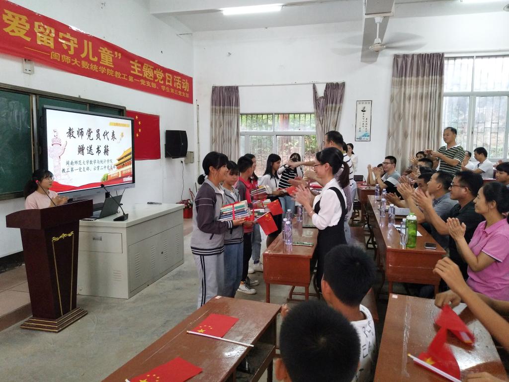 10月12日,韩国av 学生第三党支部联合教工第一党支部,与云霄二中党支部三方合作共建,开展“不忘教育初心,关爱留守儿童”主题党日活动。通过建立“‘常青数 快乐学’党员爱心书吧”,以“一本书籍,两地互动,情牵三方”的形式构建起师生党员新的服务平台。云霄县教育局副局长吴按田、学院院长林梦雷、云霄二中校长方圩滨、云霄二中党支部书记施进全以及相关学院和云霄二中相关人员参加活动。