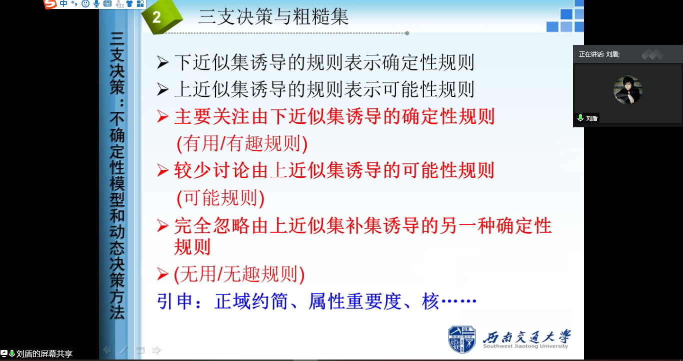 邀请,7月4日上午,西南交通大学刘盾教授在腾讯会议作了题为《三支决策:不确定性模型和动态决策方法》的报告。相关师生聆听了此次报告,报告由廖淑娇副教授主持。