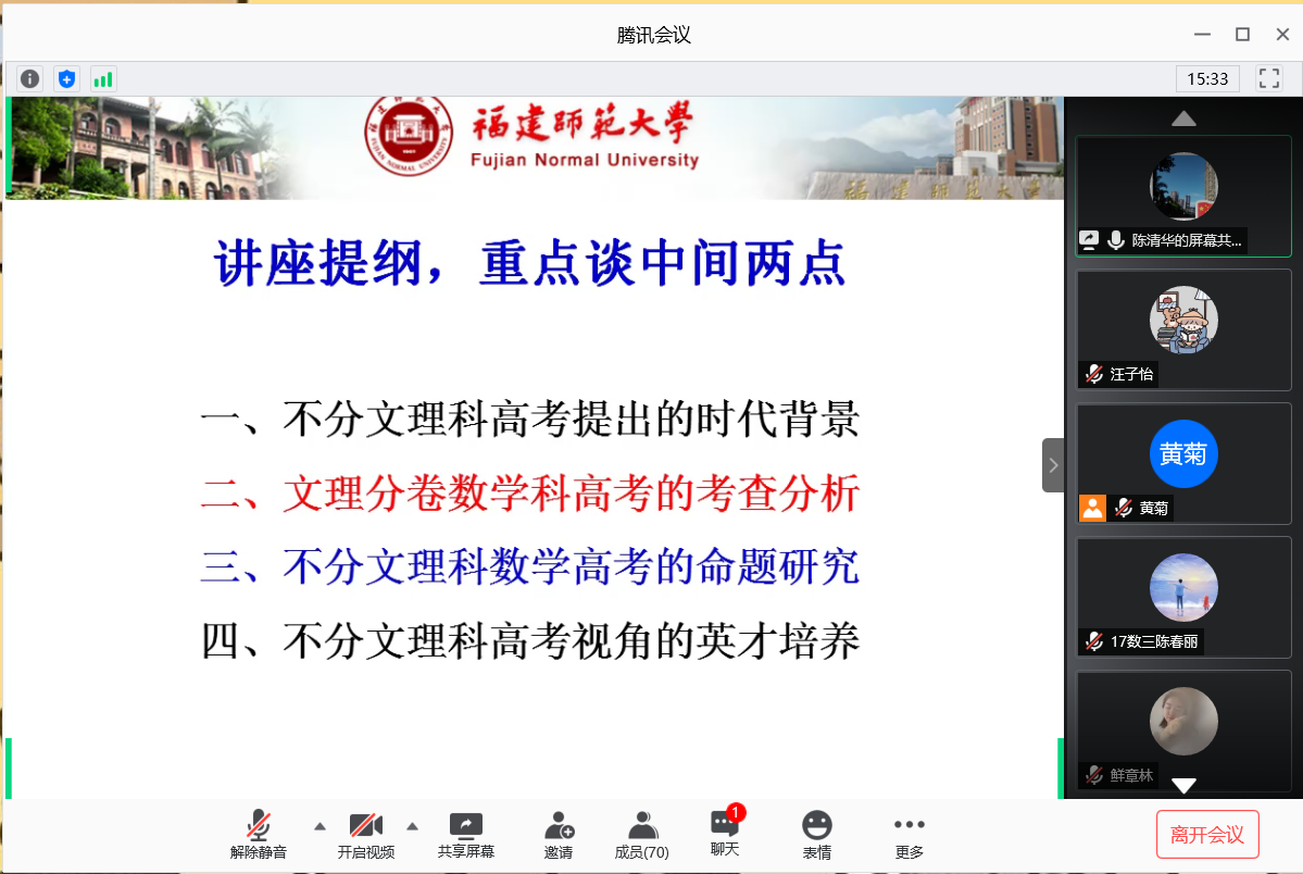 邀请,6月28日晚上,福建师范大学陈清华教授在腾讯会议作了《不分文理科背景下数学科高考命题的相关研究》的报告。相关师生聆听了此次报告,报告由李建喜副院长主持。