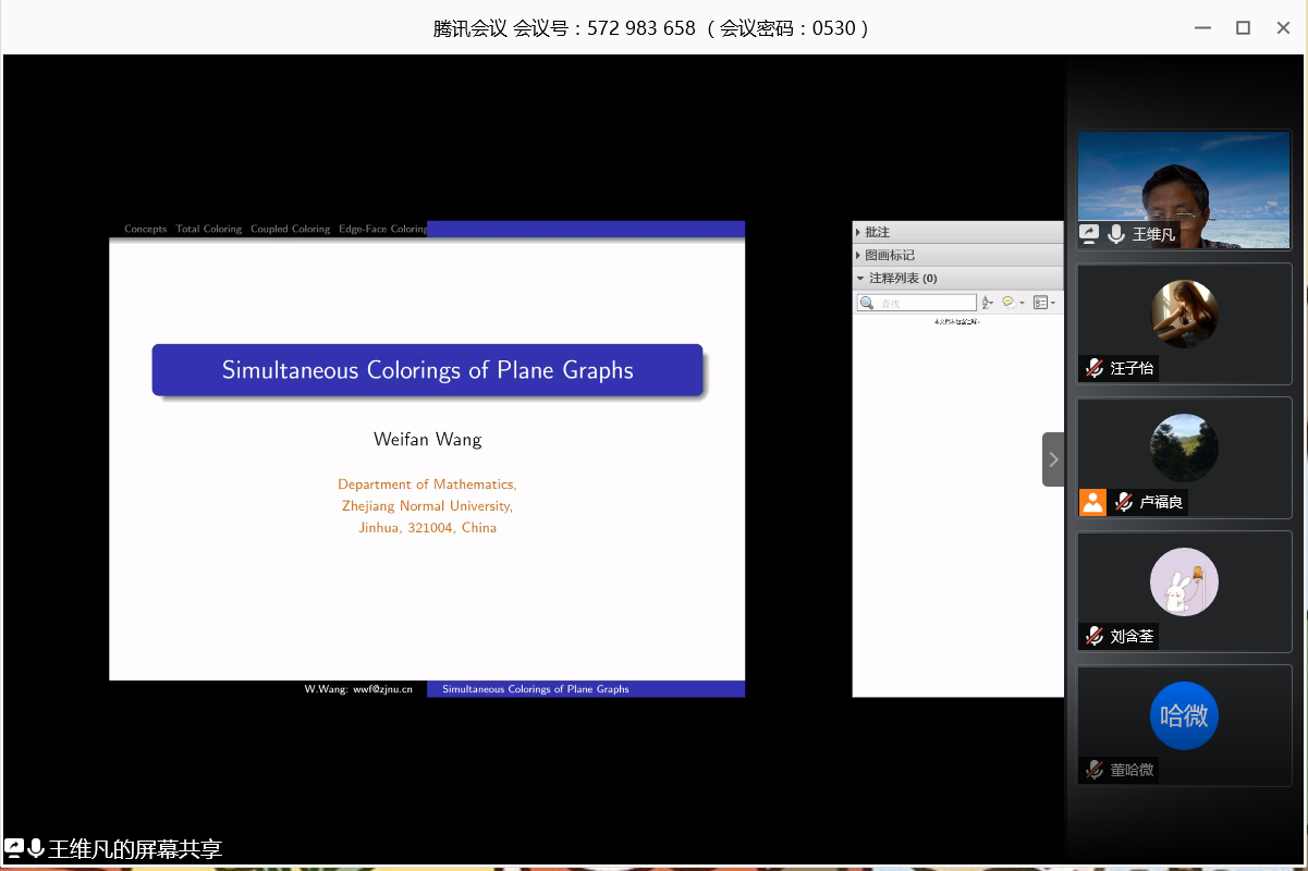 邀请,5月30日上午,浙江师范大学王维凡教授在腾讯会议作了《Simultaneous Colorings of Plane Graphs》的报告。相关师生聆听了此次报告,报告由卢福良教授主持。