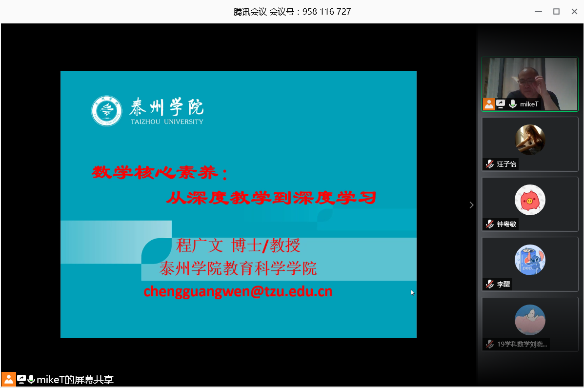 邀请,5月26日晚上,泰州学院程广文教授在腾讯会议作了《数学核心素养培养:从深度教学到深度学习》的报告。相关师生聆听了此次报告,报告由周仕荣教授主持。
