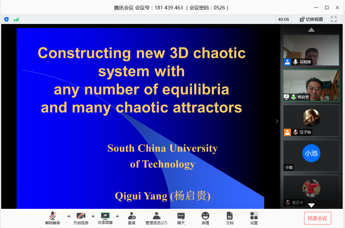 邀请,5月26日下午,华南理工大学杨启贵教授在腾讯会议作了《Constructing new 3D chaotic system with any number of equilibria and many chaotic attractors》的报告。相关师生聆听了此次报告,报告由吴晓锋教授主持。