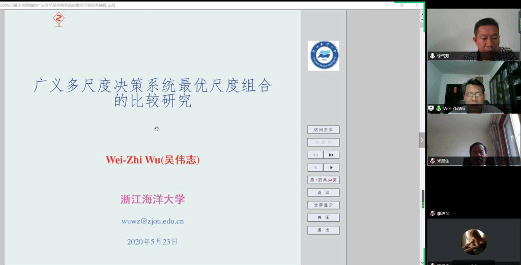 邀请,5月23日上午,浙江海洋大学吴伟志教授在腾讯会议作了《广义多尺度信息系统中基于信息熵的最优尺度组合选择》的报告。相关师生聆听了此次报告,报告由陈锦坤老师主持。