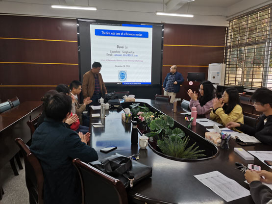 邀请,12月28日的上午,大连理工大学的鲁大伟教授在砺志楼114作了《The first exit time of a Brownian motion》的报告,相关师生聆听了此次报告。