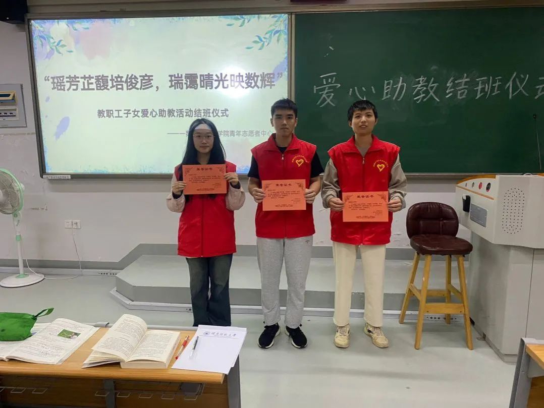 最后,爱心助教活动负责人为本学期志愿服务优秀助教老师进行表彰,并为他们颁发证书并合影留念。他们分别是:22数二叶佳熔、22数据杨艺仕、23数三游伟坤。