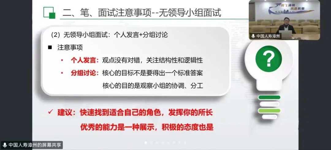 召开“解锁银行保险岗,共赴职业新航道”线上主题沙龙活动,为正处在求职关键期的2025届毕业生送去“及时雨”。此次活动邀请中国人寿漳州分公司人力资源部经理、中国人寿漳州分公司党委组织部部长柯培辉作为主讲嘉宾,为即将步入职场的毕业生传授宝贵的求职笔试、面试技巧,助力他们提升就业竞争力,在求职道路上精准发力。会议由研究生辅导员李伟俊老师主持,21级辅导员李巍婷老师和2025届毕业生参加本次活动。