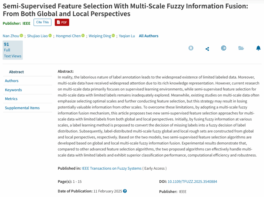 硕士研究生周楠在导师廖淑娇教授(通讯作者)的指导下,以第一作者身份在国际知名学术期刊《IEEE Transactions on Fuzzy Systems》(SCI一区,Top期刊)上发表题为“Semi-supervised Feature Selection With Multi-scale Fuzzy Information Fusion: From Both Global and Local Perspectives”的科研论文。这是韩国av
