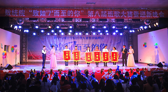 第八届班歌大赛暨2017年迎新晚会在龙文馆成功举办。学校团委及机关部分教师、数统学院党政领导、学院部分教师、辅导员及数统学院学生参加晚会。在晚会开始前,道具组、场控组、礼仪组等早早地进入紧张地筹备当中,确保整场晚会的顺利进行。随着精湛的吉他solo、歌曲串烧《致青春》,班歌大赛暨迎新晚会正式拉开帷幕。