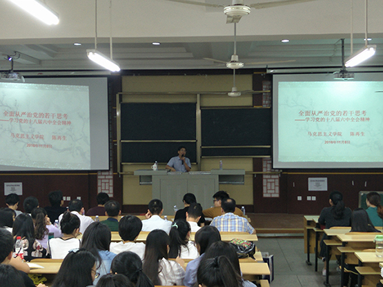 邀请马克思主义学院陈再生院长为全院师生党员举行以“全面从严治党的若干思考——学习党的十八届六中全会精神”为主题的专题学习会。