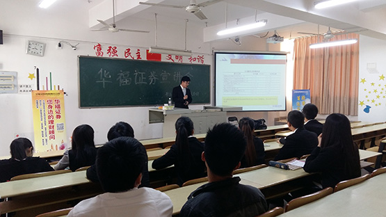 在砺志楼315举行华福证券专场宣讲会和招聘会。华福证券市场总监蓝毅蓉,投资经理夏建政、陈锰以及吴艺丹等参加宣讲。