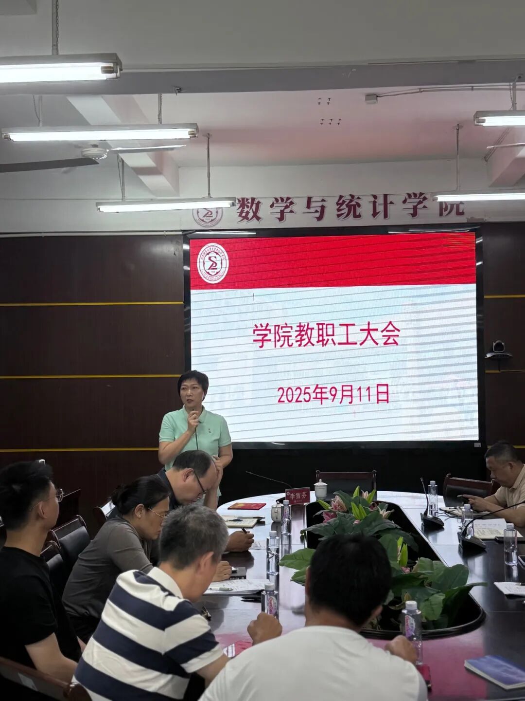 在砺志114会议室召开全院教职工大会,海外教育学院副院长李雪芬受邀出席,数统学院领导班子及全院教职工参加会议,会议由院长黄韩亮主持。