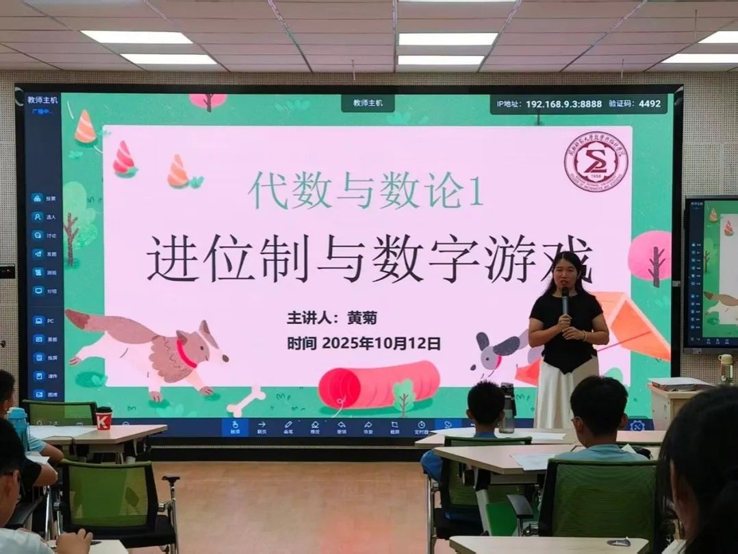 课程启动后,营员们首先通过入学检测,精准把握自身知识基础,为后续学习做好铺垫。随后,砺志楼131教室内的精彩课堂学习正式展开,黄菊老师带来了别开生面的开篇课程。她以两个妙趣横生的互动游戏为切入点,带领营员们沉浸式探究数学原理,自然而然地引入“进位制”这一核心知识点。课堂上,黄老师引导大家结合日常生活场景联想进位制的应用,营员们踊跃发言、各抒己见,在热烈的探究氛围中深化了对进位制的理解。