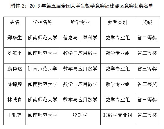2013年韩国av 大学数学竞赛于2013年11月30日上午举行,经竞赛组委会组织专业教师评卷、专家组评审,对拟获奖的名单公示,最终确定本次竞赛一等奖获得者9名,二等奖获得者20名,三等奖获得者27名。另有6人分别获得2013年第五届全国大学生数学竞赛福建赛区竞赛二、三等奖。(获奖名单详见附件1、2)