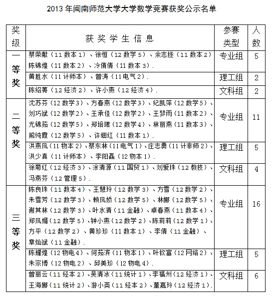 大学数学竞赛试卷评阅、评奖工作已于2013年12月5日结束。为严肃竞赛纪律,杜绝不当之风,竞赛组委会决定设立获奖结果争议期,为期7天(2013年12月6-12日)。现将获奖名单征求异议稿公布如下,公开征求广大师生的意见。