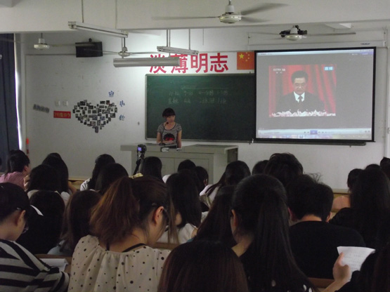 班会第一个环节,主持人黄玉梁组织全体同学观看胡锦涛总书记的重要讲话视频,并就胡总书记对广大青年提出的五点希望交流感想、心得。