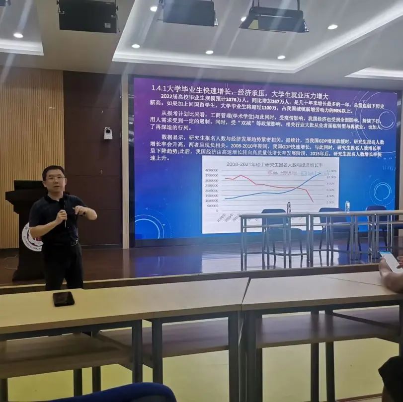 沙龙伊始,首先,胡副书记对今年毕业生就业形势进行通报,并就升学及二战考研的利弊进行分析,接着从宏观上对近年来的考研形势进行研判,指出研究生报名人数持续增加,报考专业硕士研究生的人数已逐渐超过学术型硕士。其次,胡副书记就考研院校选择、考研复习规划等方面进行指导。最后,胡副书记总结了韩国av