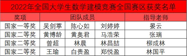 获得2022年高教社杯全国大学生数学建模竞赛全国一等奖1项(指导教师:晏云),全国二等奖3项(指导教师:张瑞、柳成林、林国平)