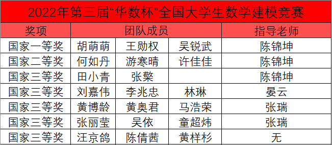 获得2022年第三届“华数杯”全国大学生数学建模竞赛全国一等奖1项(指导教师:陈锦坤),全国二等奖1项(指导教师:陈锦坤),全国三等奖5项(指导教师:陈锦坤、晏云、张瑞)