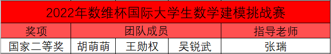 获得2022年数维杯国际大学生数学建模挑战赛全国二等奖1项(指导教师:张瑞)