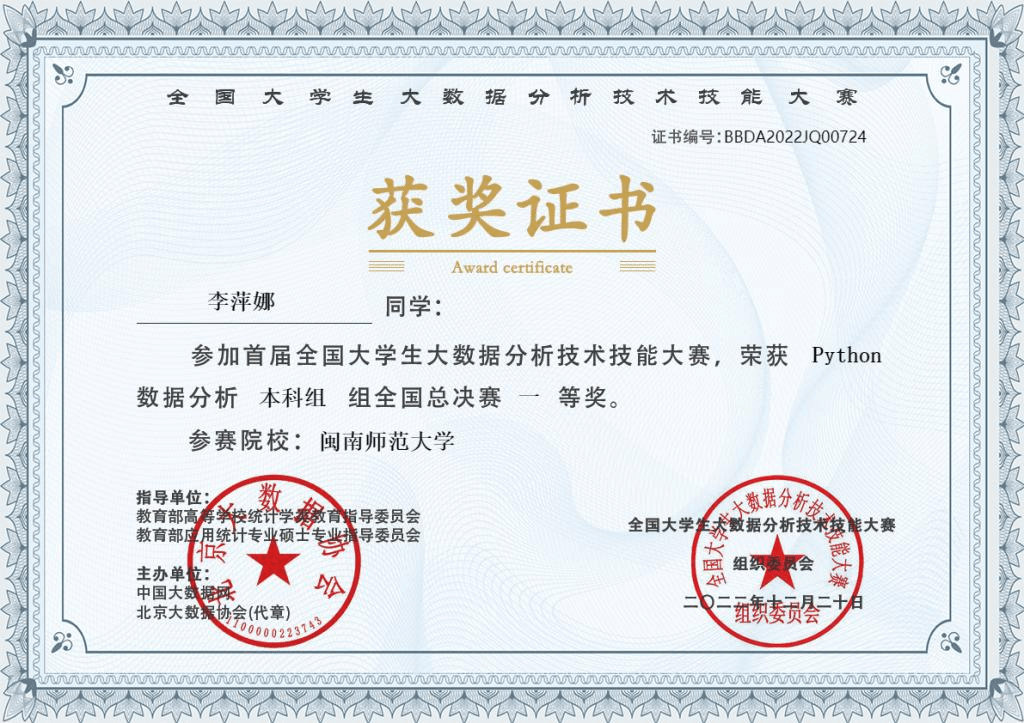学子共有4位同学获得省级一等奖,按照赛事规则,推荐参加2022年12月11日的全国赛。来自北京大学、南开大学、复旦大学、中央财经大学等400多所高校的千余名省级赛一等奖获奖学生集结赛场,争夺全国大学生大数据分析技术技能大赛的全国总决赛奖项。
