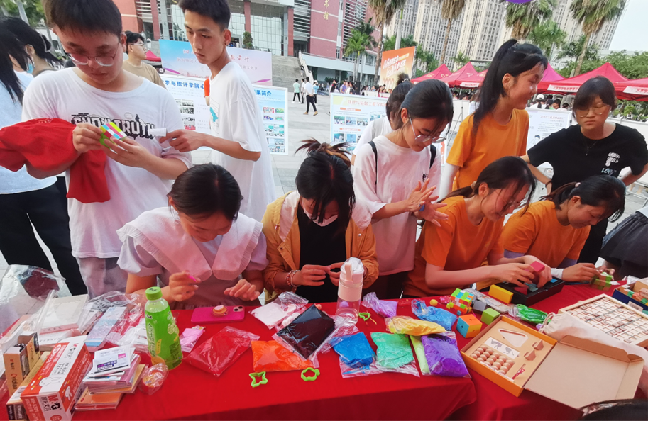 心理自助中心准备了益智教具、轻粘土、以及记忆小游戏,同学们根据提供的难易程度不同的教具,利用所学的数学知识解答通关,在体验乐趣的同时锻炼数学思维,培养理性思维、和平心态。